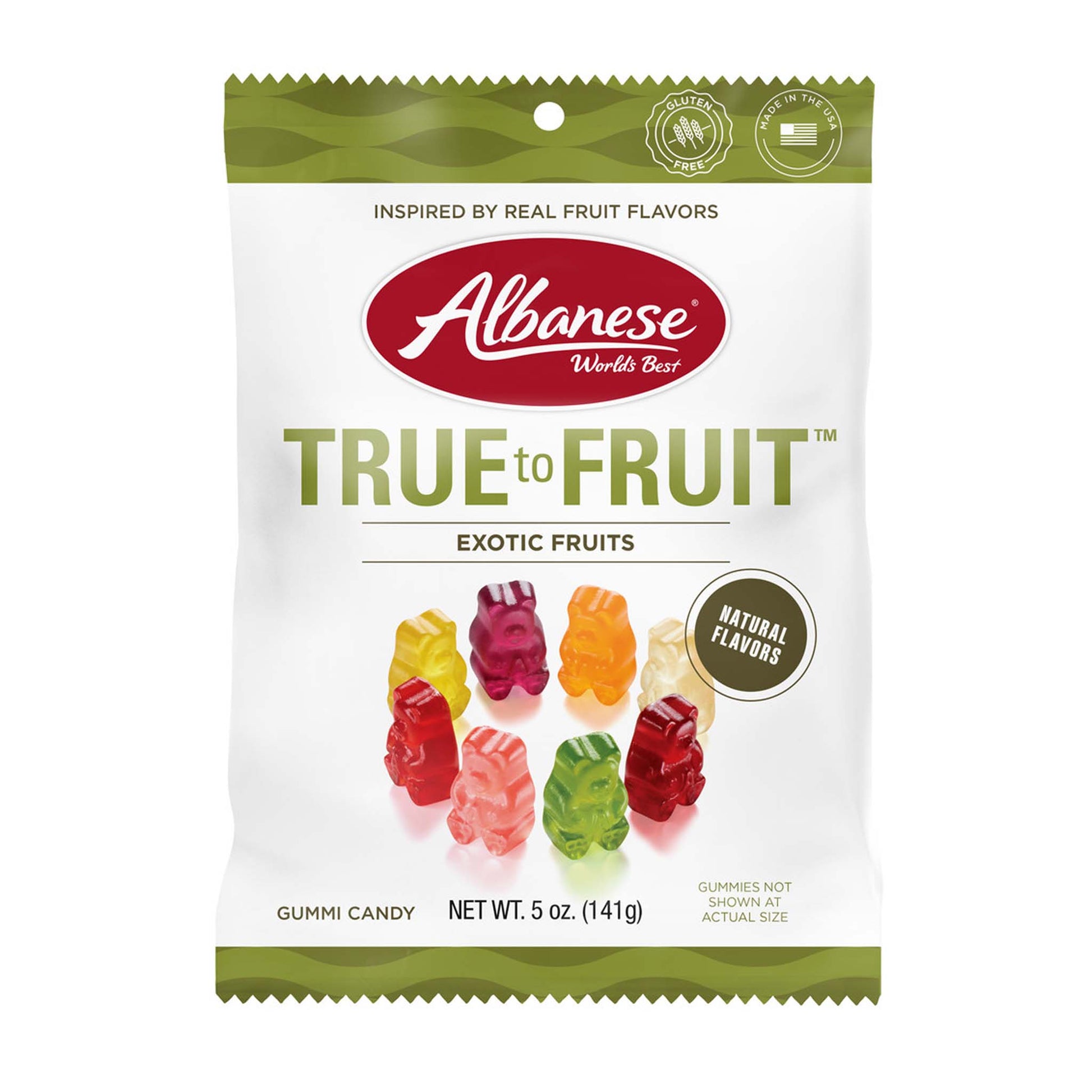 Albanese True to Fruit Gummi Bears in small, scrumptiously snackable bags! Great portions and easy to carry around for an on-the-go treat anytime, anywhere! These Natural Flavor Exotic Fruits will delight your senses. Inspired by Real Fruit Flavors including Alphonso Mango, Asian Pear, Black Currant, Blood Orange, Crimson Cranberry, Fuji Apple, Queen Pineapple and Rubus Raspberry.