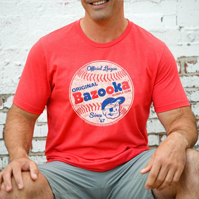 Relive the nostalgic connection between Bazooka bubble gum and baseball with this playful red tee! Officially licensed and crafted from high-quality materials, this vintage-inspired unisex shirt offers both comfort and stylish. Perfect for game day or casual wear, it's a home run for any Bazooka fan's wardrobe!