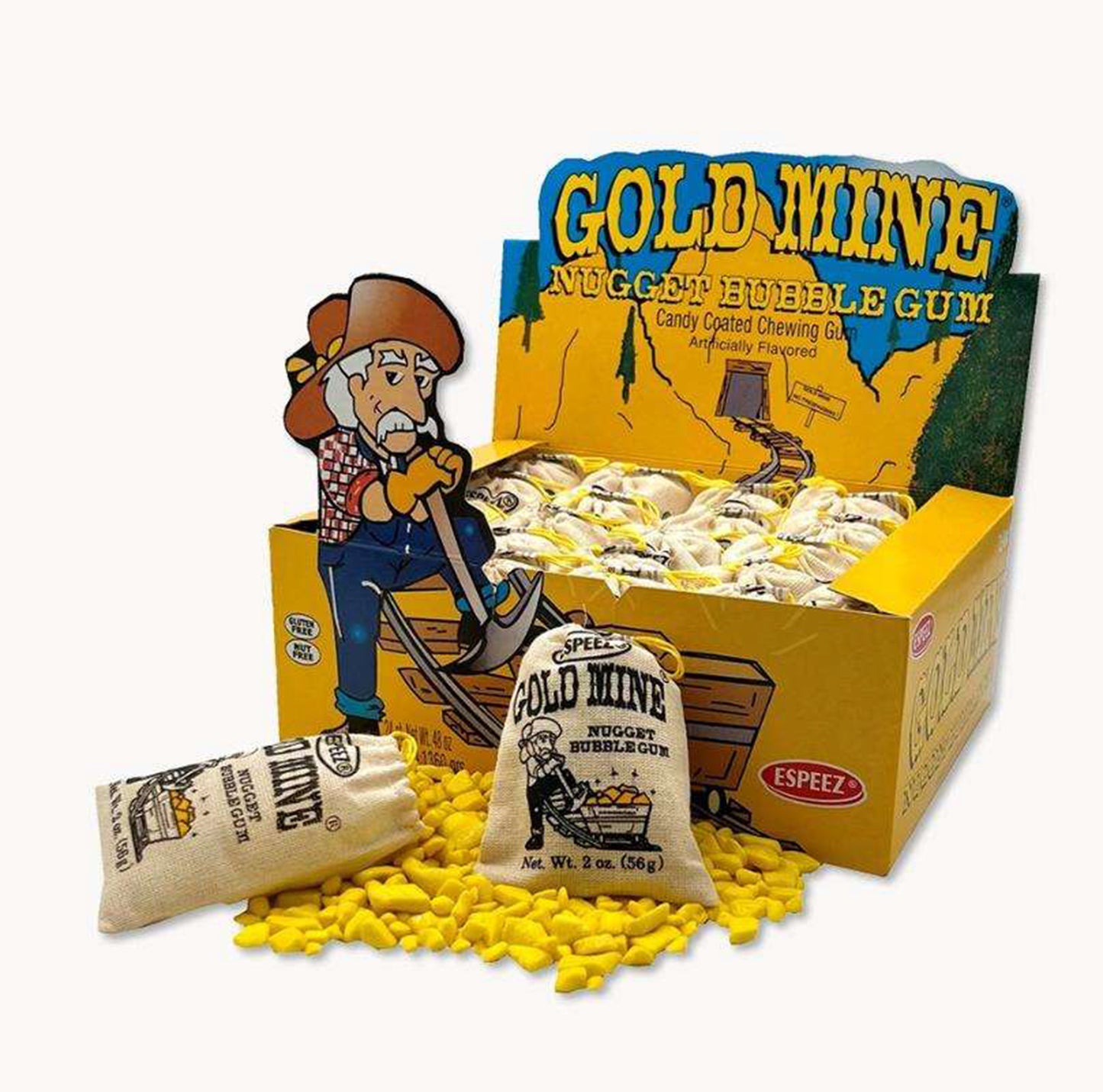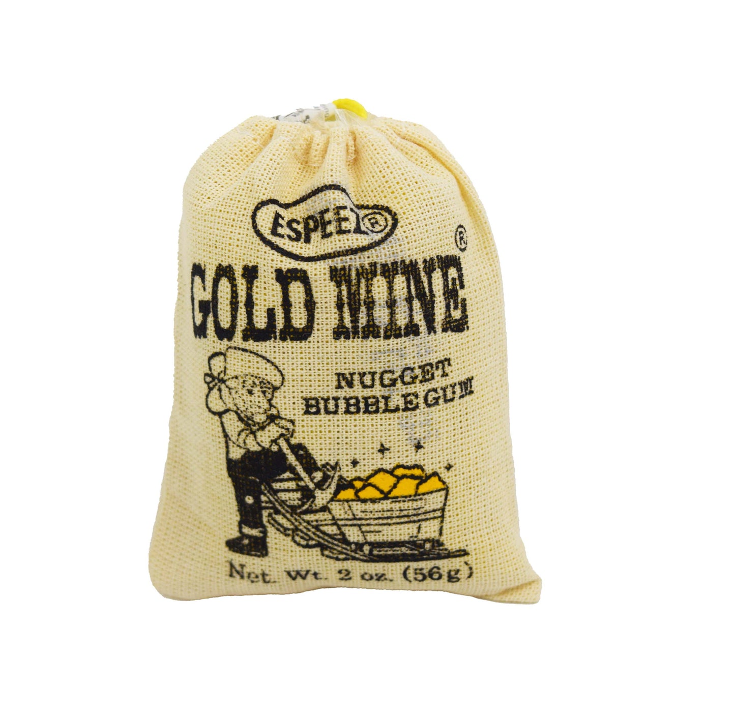Strike it rich with Gold Mine Gum! Sweeten your taste buds with this candy-coated chewing gum, shaped like real gold nuggets. Transport yourself back in time with vintage illustrations, all packaged in a unique cloth bag. A fun twist on traditional bubble gum - perfect for any gum lover!