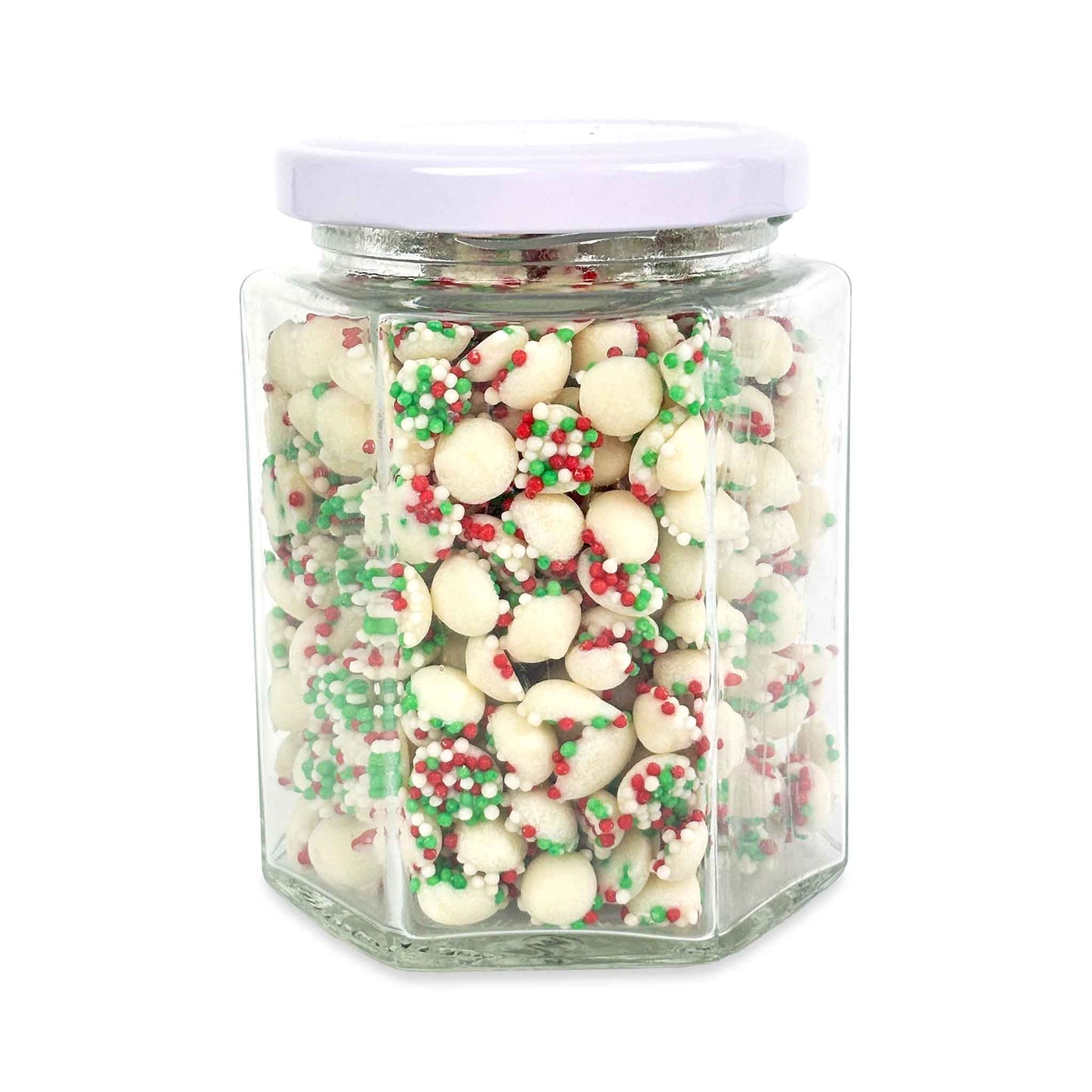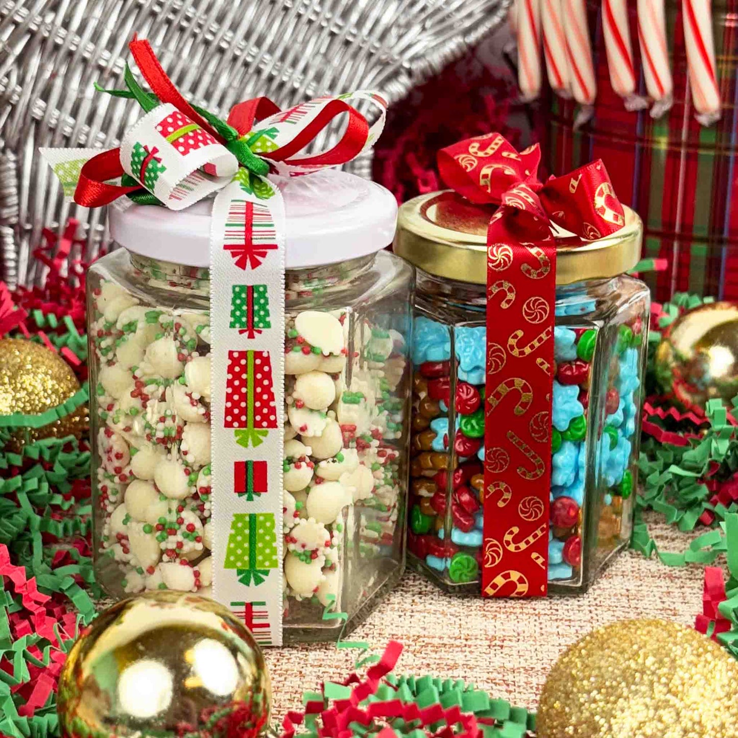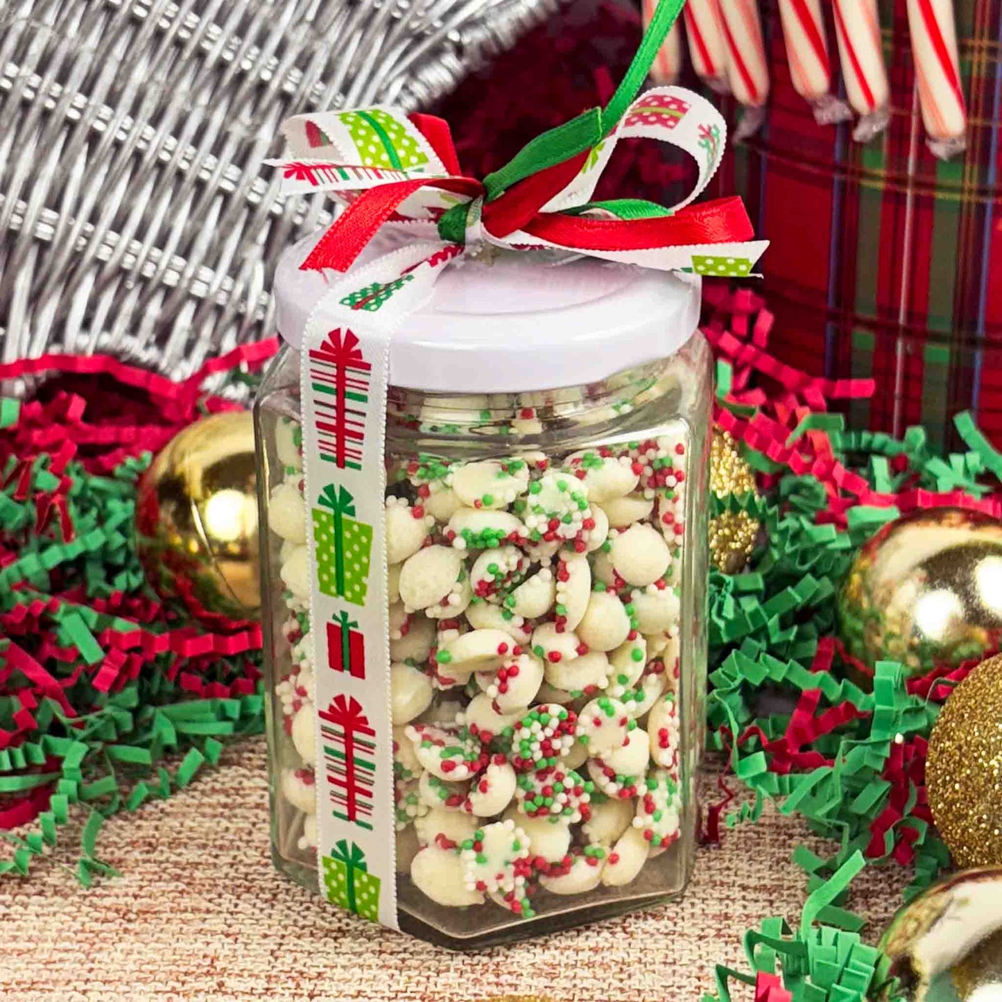 It's the Holidays in a jar! This jar contains Mini Christmas Mints and makes a great gift. The jar is reusable and contains about 7 oz. of Christmas candy goodness.
