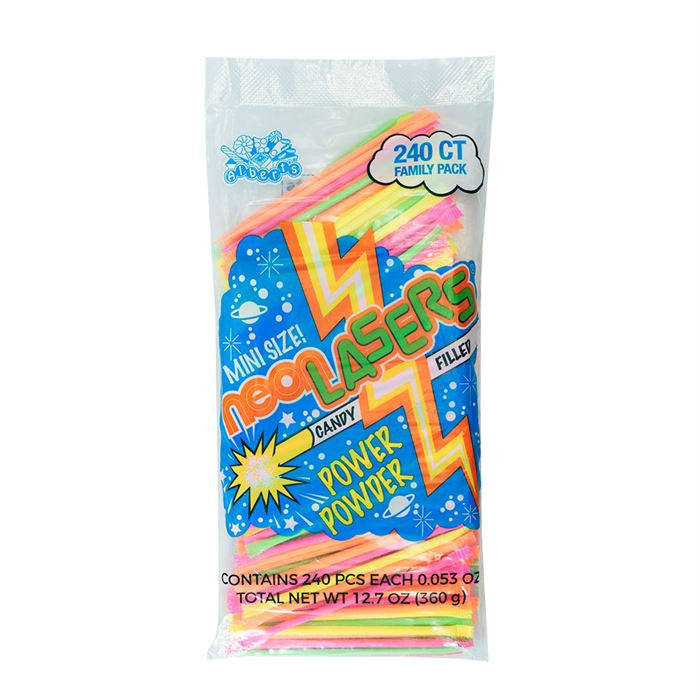 Super flashy and super tart these Neon Laser Straws will make anyone pucker with happiness! Each bag comes with 240 straws to share with ALL of your friends so you can have the ultimate POWER POWDER PARTY! Colorful , Bold and Tasty you don't want to miss out on these lightning bright Neon Straws!