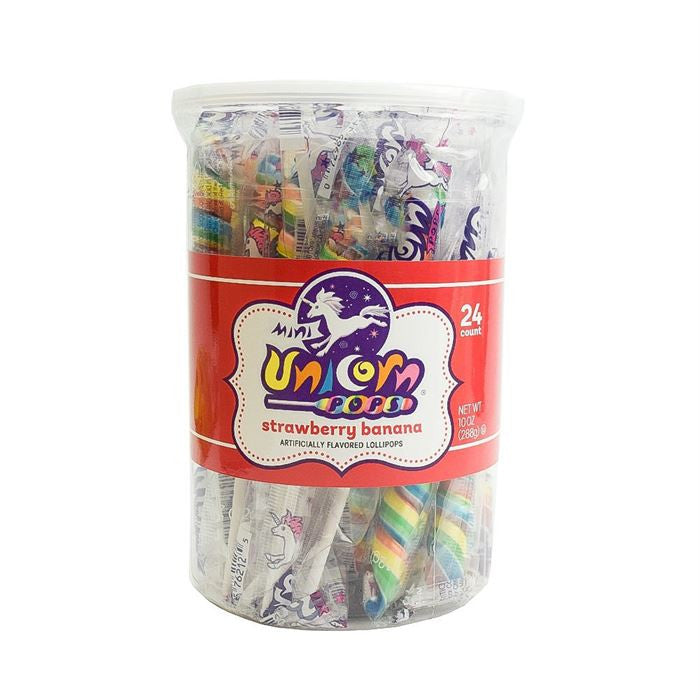Hello pretty Unicorn Pops, you look so magical! These Strawberry Banana flavored lollipops come in a 24 Count tub and are individually wrapped, making them a perfect treat to share with friends.