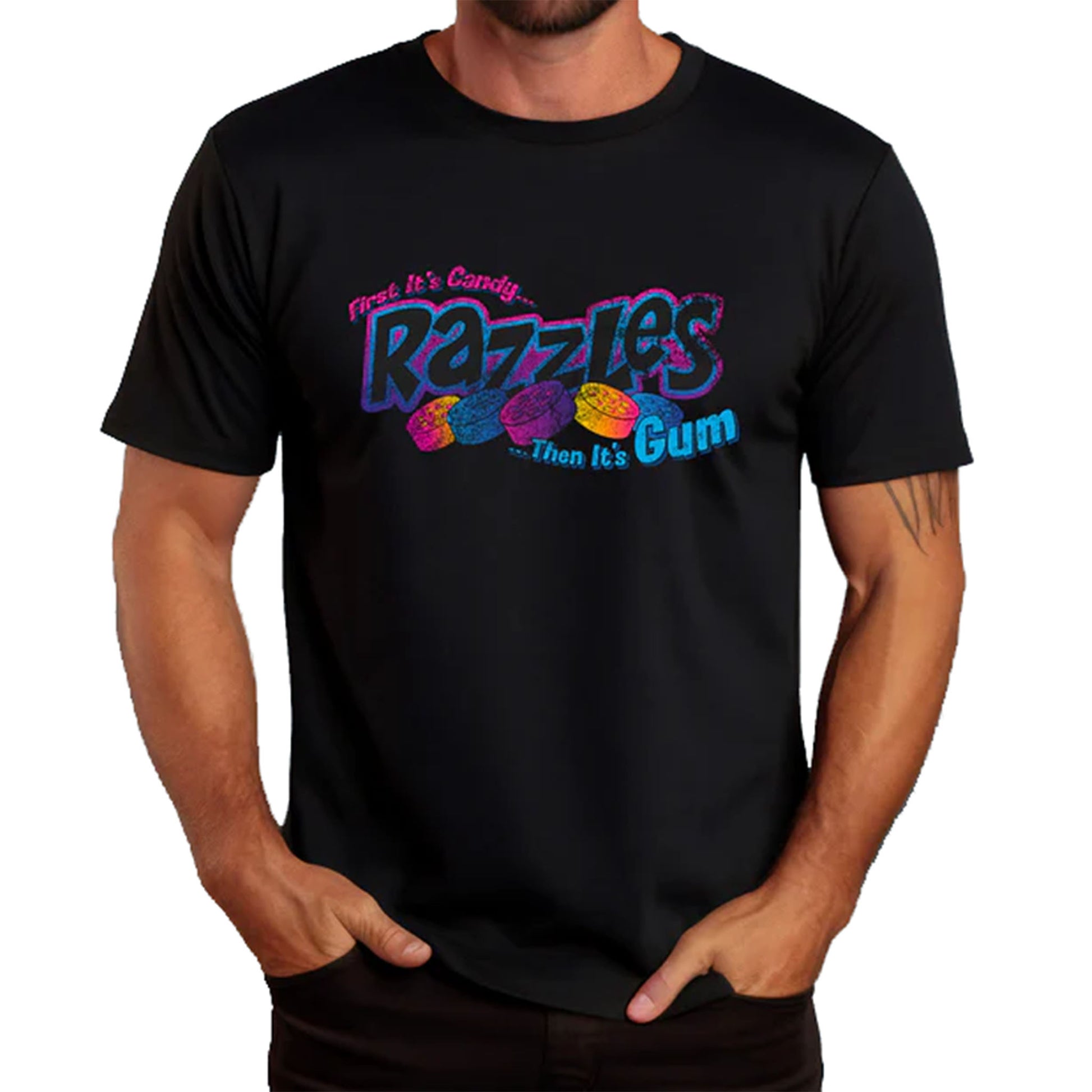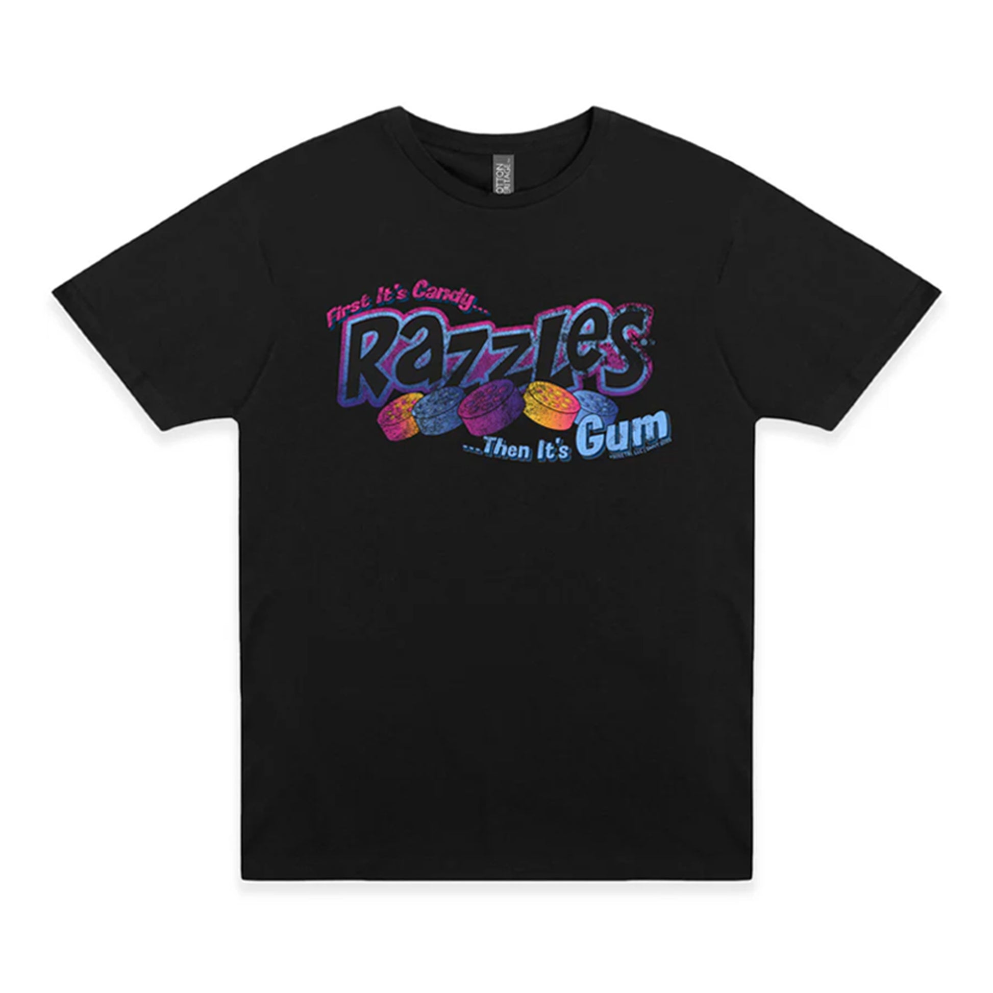 Razzles first appeared in 1966 and were the first candy of its kind! It quickly became a very popular candy here in the United States, and with such unique packaging, we just had to put it on a shirt! The bright colors of the Razzles logo against the dark color of the shirt results in a fashionable retro tee.