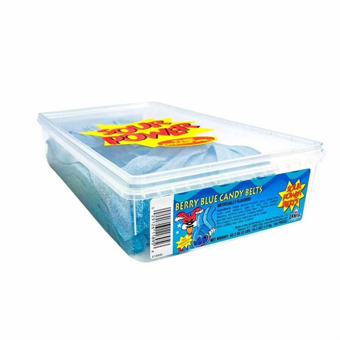 These delicious, chewy Sour Belts feature a mouthwatering sour Berry Blue flavor any sour candy lover will enjoy! Sour Power Berry Blue Belts are a great candy for parties- the tub even comes with serving tongs to make sure every guest gets a mouthful of Berry Blue Sour Power deliciousness! Each 42.3 Tub included a whopping 150 Belts so you don't have to worry about running out!